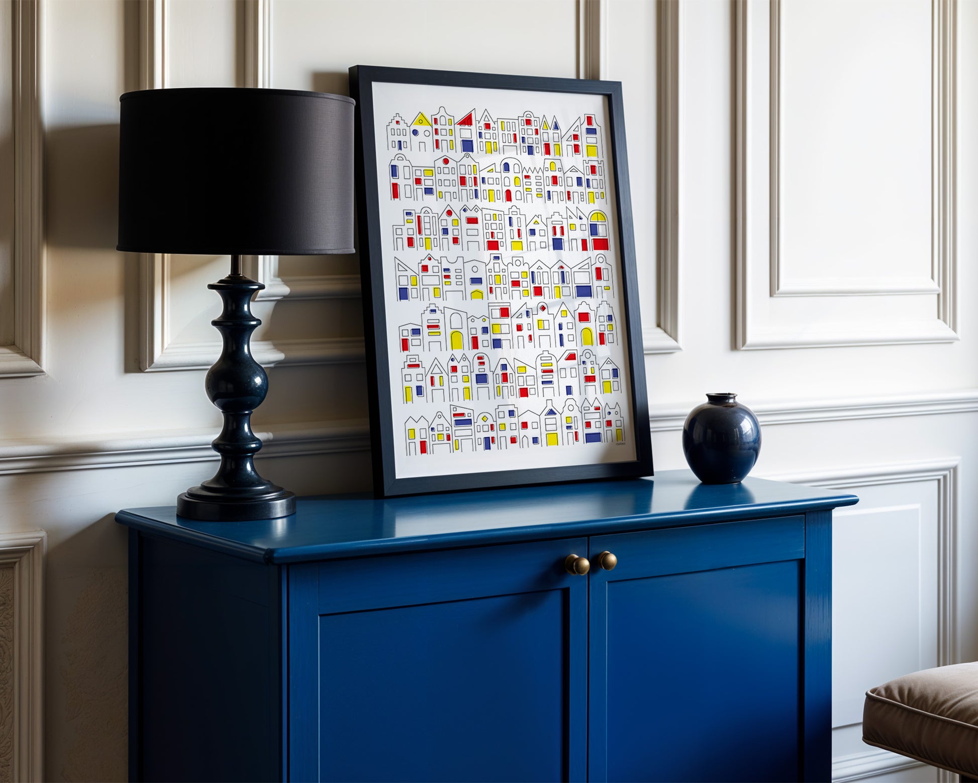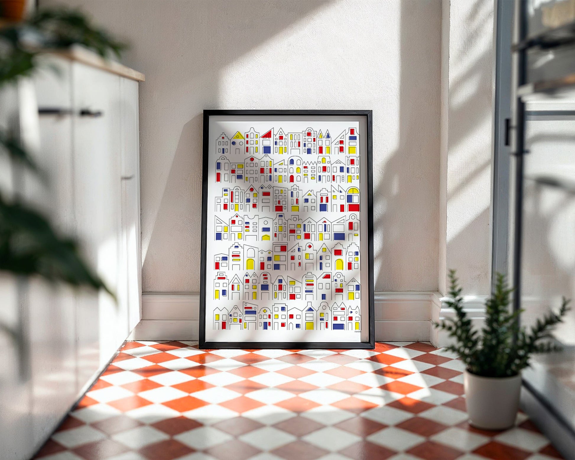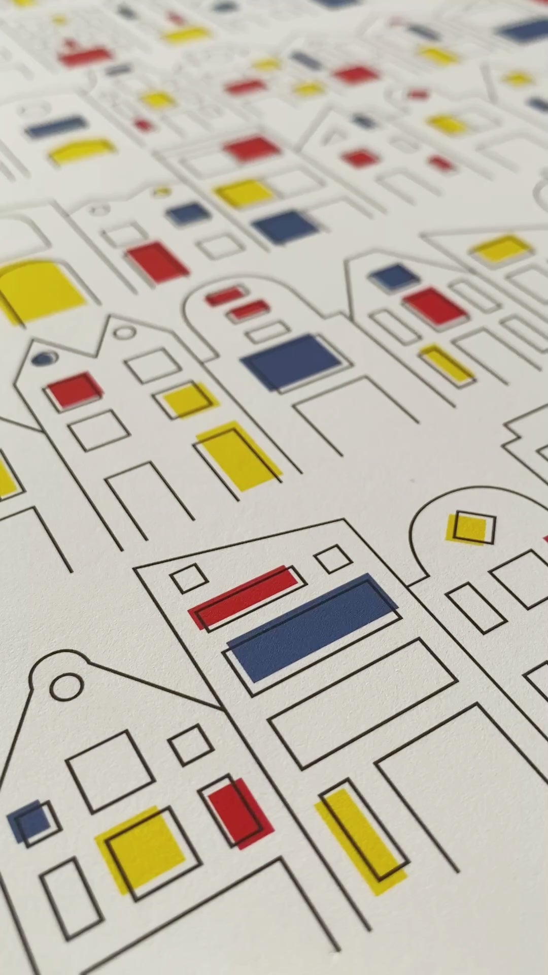 These aren't ordinary houses—these are Dutch mansions! Graphic line drawings of typical Dutch homes, dressed in Mondrian-esque blocks of color. It's as if Dutch architecture has become a bit more modern and suddenly decided to splash out on color. A stylish blend of classic and abstract, for anyone who loves our iconic homes, but with a twist.